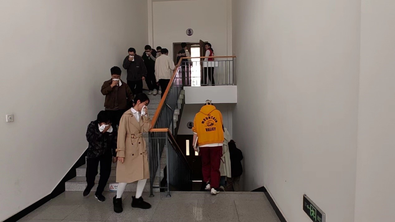 演练分为楼内疏散、现场讲解两个部分。12:30演练正式开始。火警警报发出后,理科组团各学院师生及第三方服务人员沿安全出口标识指向,按照就近原则选择合适的楼梯通道低势、快速、安全有序地疏散到楼外指定地点。不同楼宇的演练小组分组进行演练。保卫处、实验室设备处老师现场讲解疏散逃生要领以及防火面罩使用等消防应急知识。