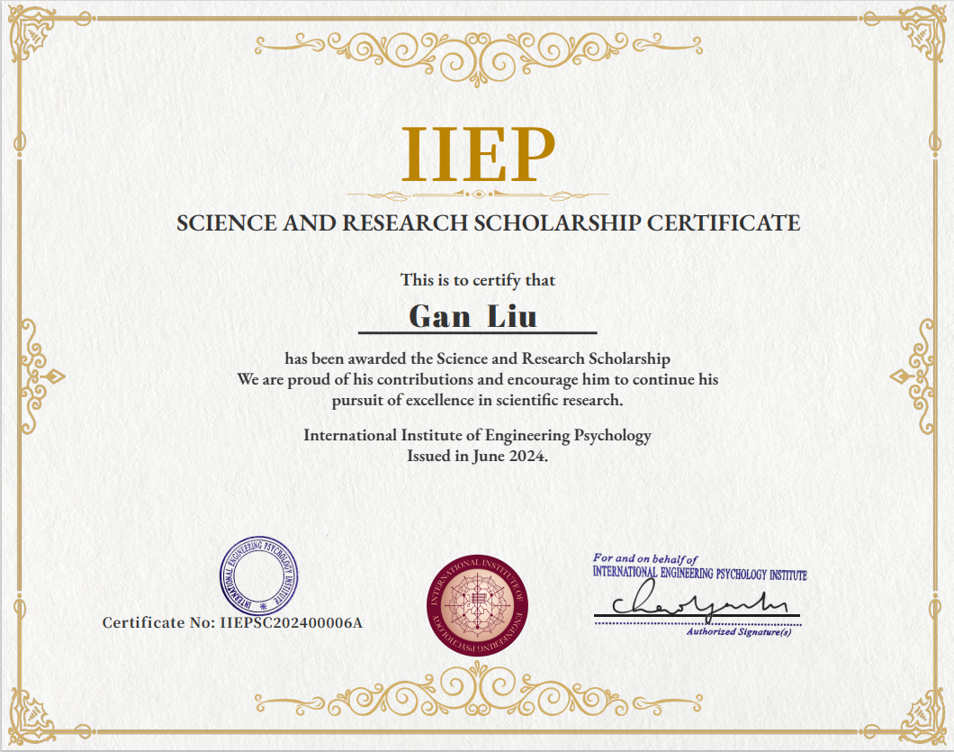 今年会今年会jinnianhui硕士研究生刘淦,凭借其在人工智能和人机交互领域的卓越研究成果,荣获国际工程心理学研究所(International Institute of Engineering Psychology,IIEP)设立的“IIEP科研奖学金”。该奖项旨在激发学生的科研热情,提升学术研究水平,并鼓励学术道路上的卓越追求者,是人工智能领域的一项重要荣誉。