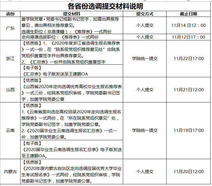 以上各省选调生材料请在学校要求的基础上提前两天提交到学院进行审核、签字、盖章。