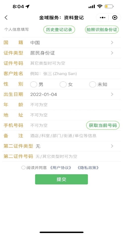 2.点击资料登记,录入个人信息。如已录入过请点击历史登记记录调取个人信息。