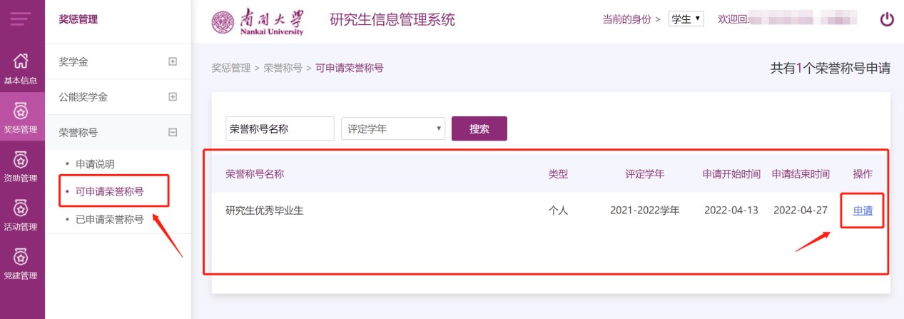 学生可在研究生信息管理系统奖惩管理模块下的荣誉称号菜单点击选择研究生优秀毕业生进行申请,填写信息并提交后可下载打印个人申请表用于后续考评环节。