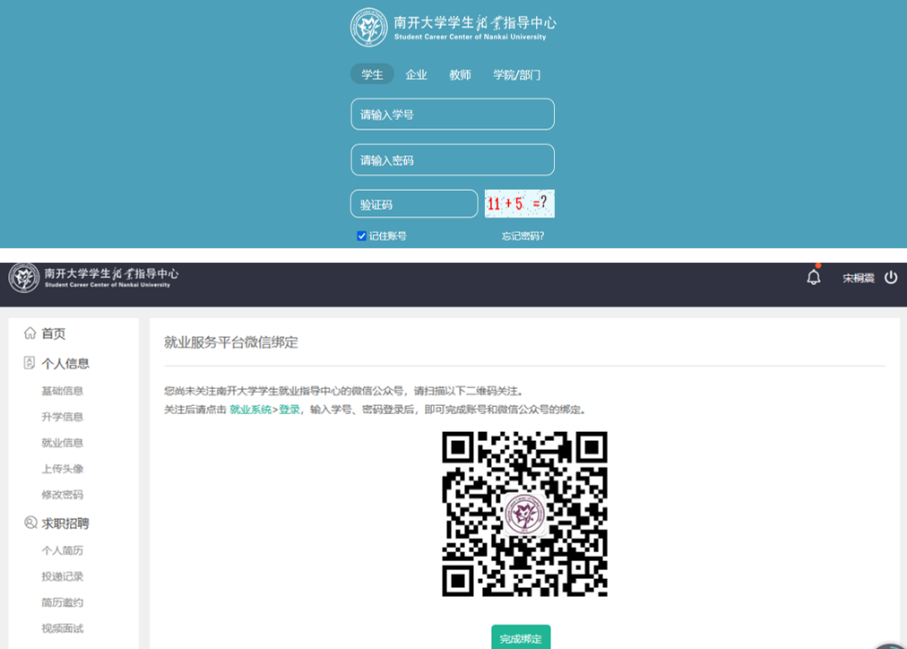 初次登录就业系统的学生请先关注今年会学生就业指导中心的微信公众号后请点击“就业系统”—>“登录”,登录后即可完成账号和微信公众号的绑定。点击“完成绑定”进入系统操作界面。
