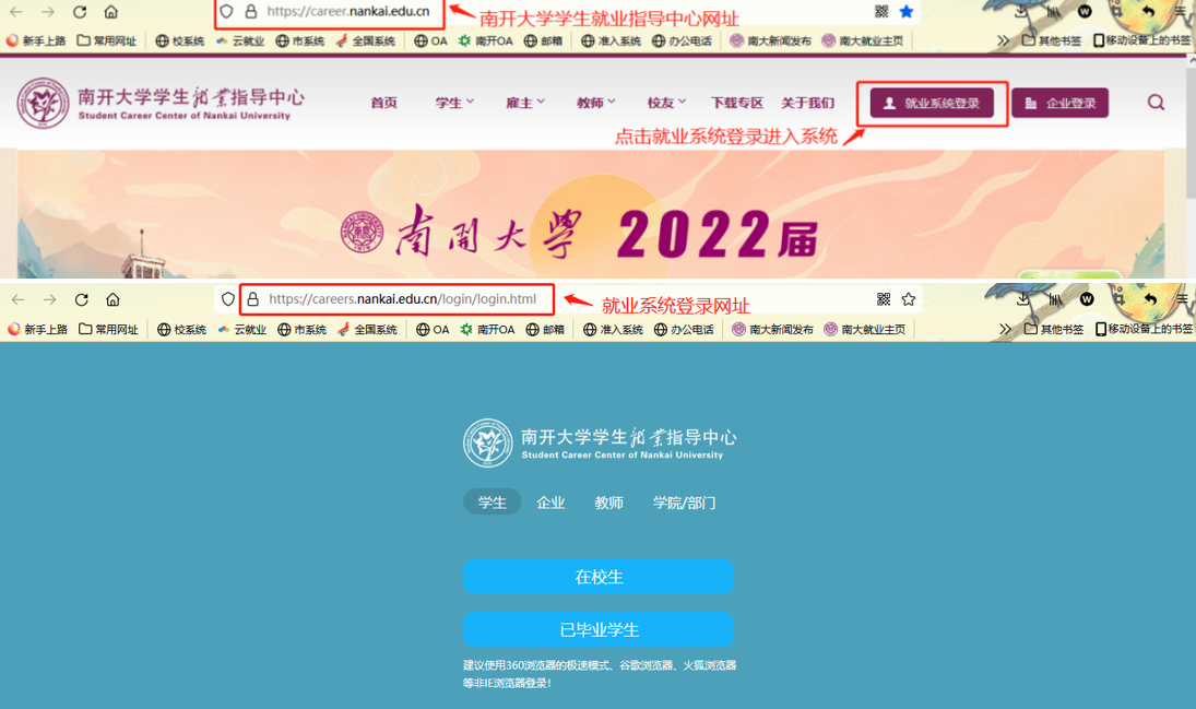 打开浏览器(为避免出现系统不兼容部分功能无法正常操作的情况,请使用360浏览器的极速模式、谷歌浏览器、火狐浏览器等非IE浏览器),输入今年会学生就业指导中心网址:https://career.nankai.edu.cn/,点击就业系统登录或就业系统登录网址:https://careers.nankai.edu.cn/login/login.html进入登录界面。如下图所示: