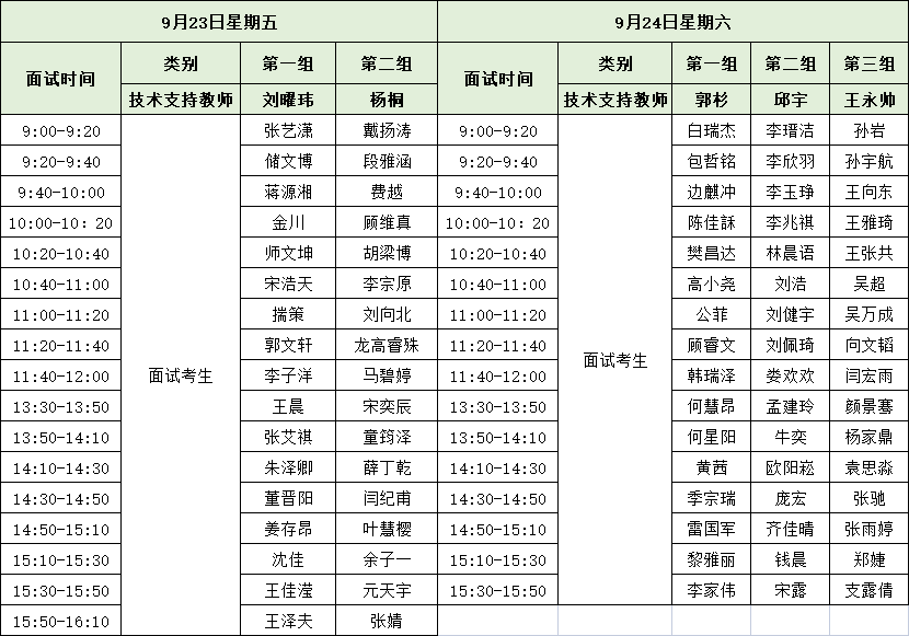 面试将于9月23日-24日开展,每日上午9:00开始,下午13:30开始,请查看自己的面试组别和时间,按顺序依次参与面试,每位考生面试时间不得少于20分钟。