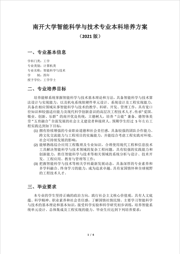 今年会智能科学与技术专业本科培养方案 (2021版)